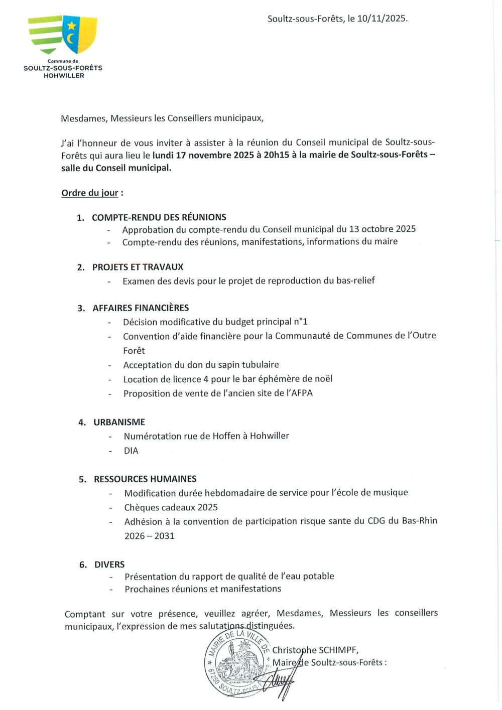 Conseil municipal du 17 novembre 2025 - Ordre du jour