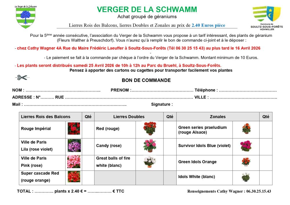 L'Association du Verger de la Schwamm organise un achat groupé de Géraniums. La commande est réservée aux habitants de Soultz-sous-Forêts et Hohwiller.