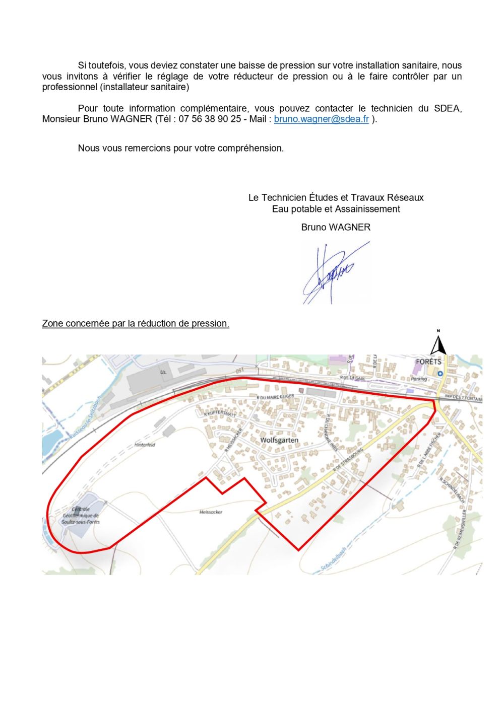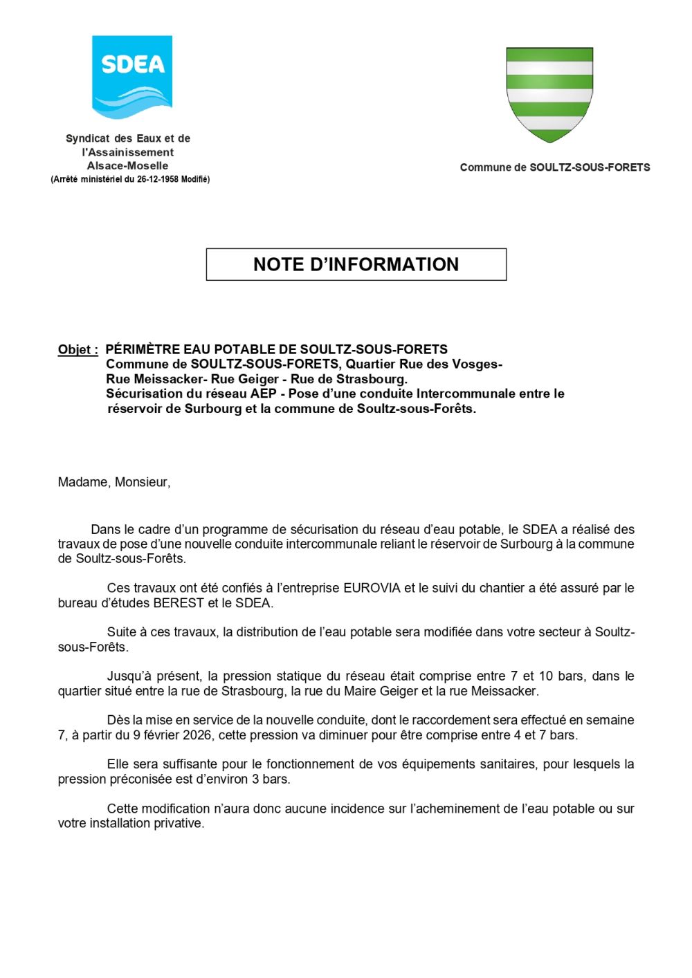 Dans le cadre des travaux de raccordement et de mise en service de la conduite de distribution d’eau potable provenant du réservoir de Surbourg, une coupure d’eau sera réalisée sur les rues de Strasbourg, du Chanoine Imbs, du Kleinwald, du Kupfersmatt, du Maire Geiger, Meissacker, des Vosges et du Wolfsgarten.