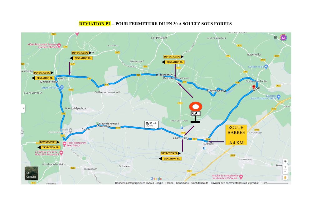 Une déviation spécifique sera mise en place pour les poids lourds, dans les deux sens de circulation par les D D264, D28, D114, D927, D250, via les communes de SOULTZ-SOUS-FORÊTS, KUTZENHAUSEN, MERKWILLER-PECHELBRONN, PREUSCHDORF, DIEFFENBACH-LÈS-WOERTH, GOERSDORF, MORSBRONN-LES-BAINS, DURRENBACH, GUNSTETT, SURBOURG.