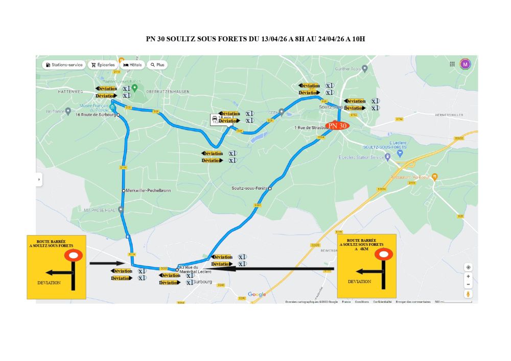 Une déviation sera mise en place pour les véhicules légers, dans les deux sens de circulation par les D264, D28, D114, D250, via les communes de SOULTZ-SOUS-FORÊTS, KUTZENHAUSEN, MERKWILLER-PECHELBRONN, SURBOURG.