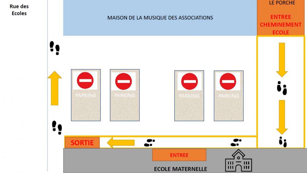 Vous arriverez à l’école en passant sous le porche de la maison des associations et accompagnerez votre enfant jusqu’au portail (! changement d’entrée, celui qui est au milieu de la cour !) en suivant le sens de circulation matérialisé au sol.